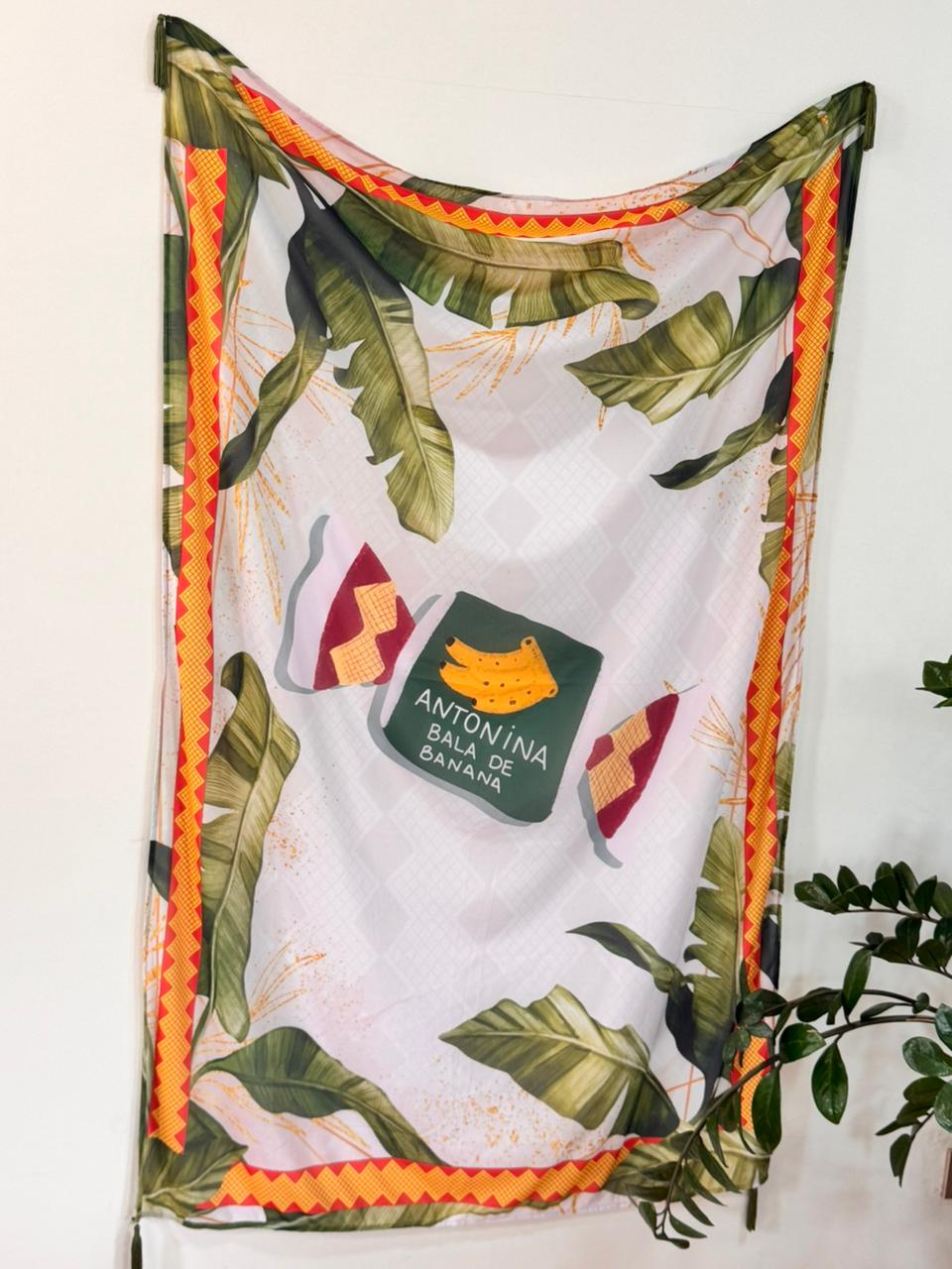 Canga de praia com tecido leve, versátil e multifuncional, usado como saída de praia, para deitar na areia ou proteger do sol, acessório de cabeça ou bolsa, sendo um item indispensável na moda praia brasileira por sua praticidade e estilo com estampa exclusiva Balas Antonina.